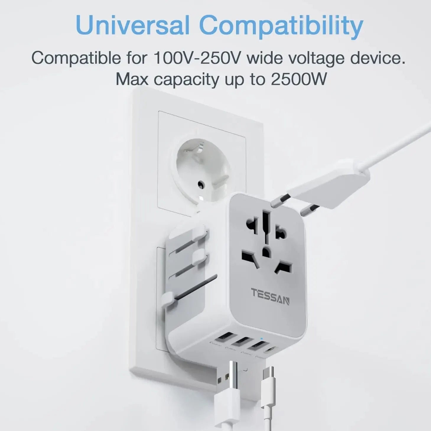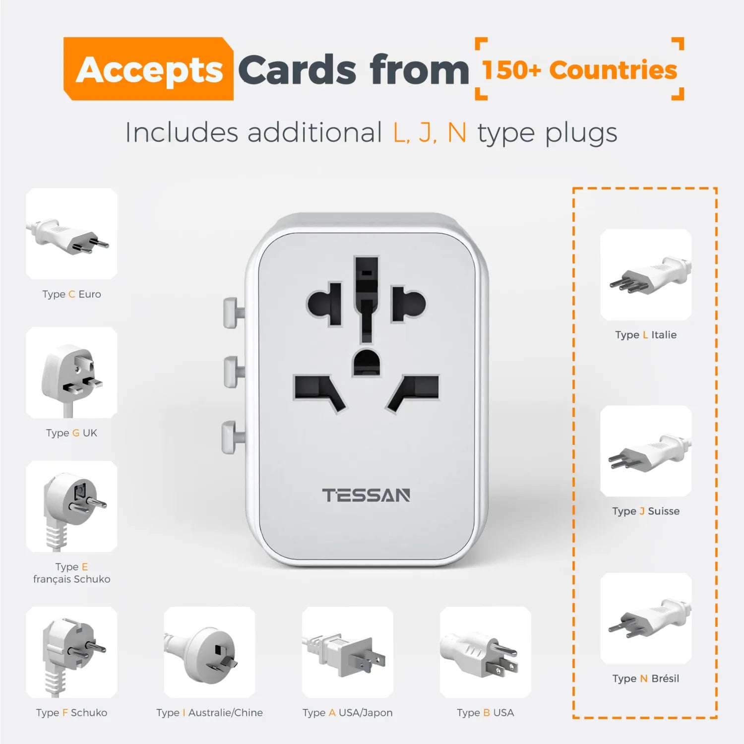 Travel effortlessly with the TESSAN Universal Travel Adapter, designed to power your devices across more than 150 countries including the US, EU, UK, Australia, and more.